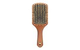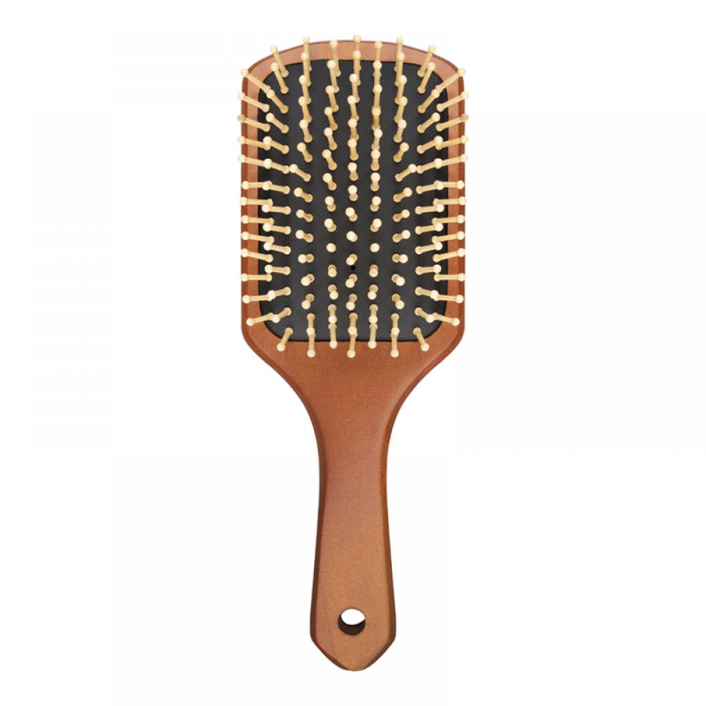 Drewniana szczotka do włosów wypozażona w drewniane szpilki, które mają zaokrąglone końcówki i umieszczone są na gumowej poduszce. Gumowa poduszka z otworem pozwala na prawidłową prace szczotki podczas czesania. posiada włściwości antystatyczne, włosy podczas czesania się nie elektryzują.