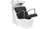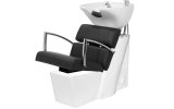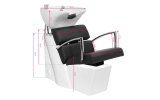 Profesjonalna myjka fryzjerska -stabilna, niezwykle wygodna, solidnie wykonana. Nowoczeny design czyni z niej piękne dopełnienie wyposażenia nowoczesnego salonu fryzjerskiego. Siedzisko wykonane z wysokiej jakości brązowej ekoskóry. Silikonowa podkładka pod głowę stabilizuje głowę klienta i pozwala na jej wygodne ułożenie na myjce. Misa myki w kolorze białym, z możliwości regulacji swojego nachylenia. Myjnia w kolorze czarnym