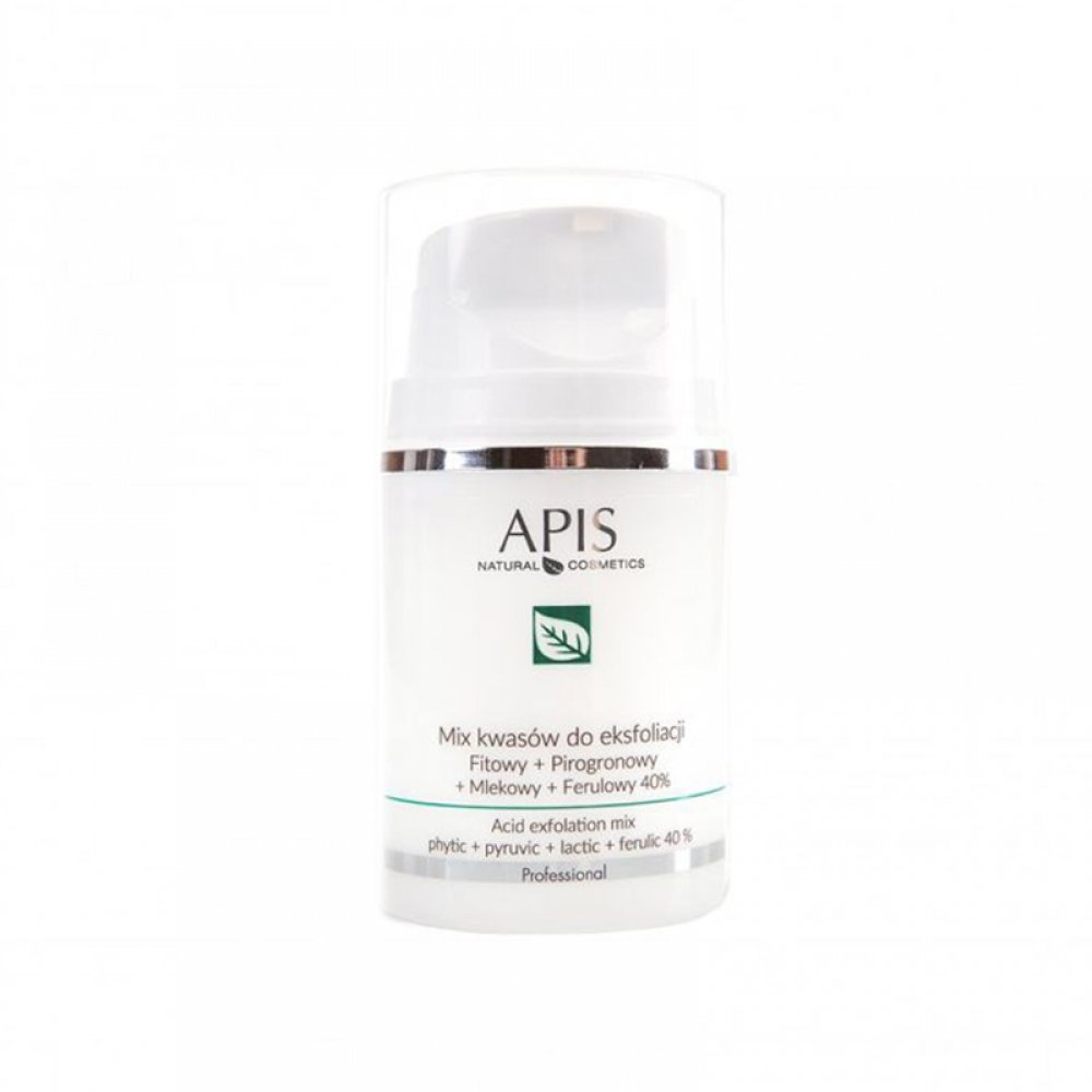 Apis Mix kwasów do eksfoliacji (Fitowy + Pirogronowy + Mlekowy + Ferulowy 40%) polecany do cery z oznakami starzenia, przebarwieniami, rozszerzonymi naczynkami, a także do cery tłustej, trądzikowej z rozszerzonymi porami. Jest to innowacyjne połączenie czterech kwasów o pH 1,4 działających na wielu płaszczyznach o niezwykłych właściwościach. Preparat intensywnie złuszcza warstwę rogową naskórka, działa przeciwstarzeniowo, obkurcza rozszerzone naczynka, rozjaśnia przebarwienia. Zamyka rozszerzone pory skóry i ma działanie bakteriostatyczne. Wykazuje także aktywność antyoksydacyjną. Mix kwasów to produkt przeznaczony do chemicznego złuszczania.