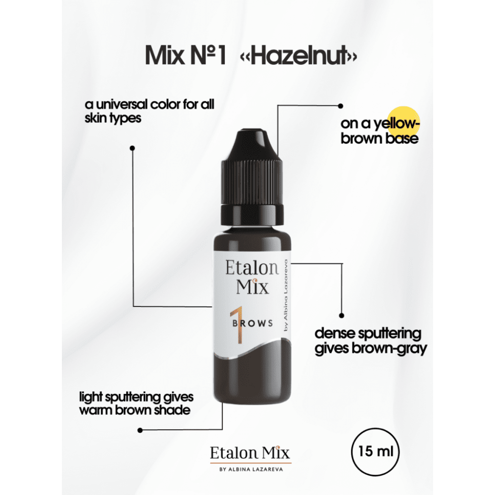 Mix 1 „Orzech laskowy” (Uniwersalny) przeznaczony do makijażu permanentnego i tatuażu.Na żólto-brązowej bazie. Uniwersalny odcień dla każdego rodzaju skóry.Przy lekkiej  pigmentacji  jest  ciepły brązowy odcień, przy mocniejszej – szarobrązowy.Świetny kolor do cieniowania na powiekach