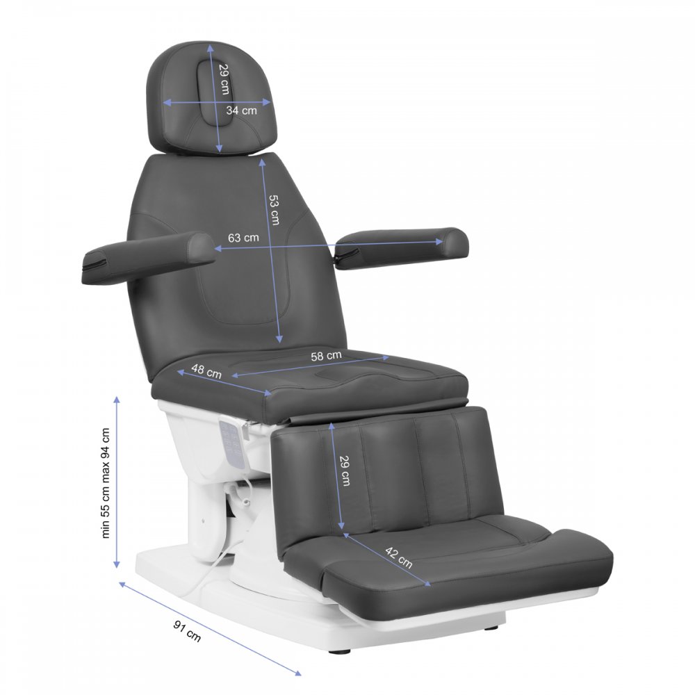 Nowoczesny fotel kosmetyczny regulowany elektrycznie, zapewniający komfort podczas zabiegu nie tylko pacjentom, ale i osobom wykonującym zabieg. Ciche 4 silniki elektryczne umożliwiające szybką i wygodną regulację fotela za pomocą pilota. Opcjonalnie istnieje możliwość podłączenia przełacznika nożnego kod 133026. Fotele mają wyprofilowane i bardzo wygodne siedzisko, są wytrzymałe oraz bardzo stabilne. Specjalna konstrukcja podnóżka ułatwia wykonywanie zabiegów pedicure i podologicznych. Zakres regulacji góra-dół pozwalający na indywidualne dostosowanie wysokości fotela do wzrostu osoby wykonującej zabieg oraz radzaju zabiegu.