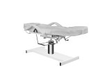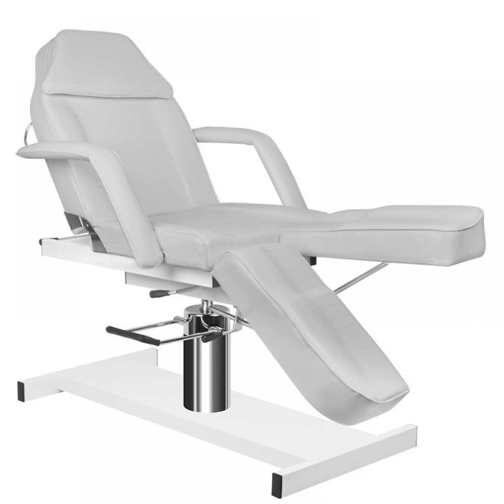 i opuszczany hydraulicznie, z otworem w zagłówku, doskonale sprawdza się w kosmetyce, zabiegach pedicure, wizażu i masażu. Posiada wyjmowane podłokietniki i zaślepkę w zagłówku. Poszycie fotela łatwo zmywalne, wykonane z eko-skóry, spełniające rygorystyczne wymogi UE, estetyczne, niklowane elementy metalowe. Fotel dostępny jest w kolorze szarym.