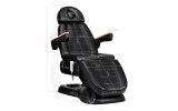 Fotel wypełniony jest pianką o odpowiedniej twardości oraz pokryty przyjemną w dotyku imitacją skóry w odcieniach czerni. Dzięki użyciu materiału, który jest łatwy do utrzymania w czystości oraz odporny na wybrane środki dezynfekcji, sprzęt jest komfortowy w użytkowaniu, wytrzymały na wilgoć oraz nieskomplikowany w czyszczeniu. Solidna podstawa wykonana z trwałego materiału w odcieniach czerni zapewnia stabilność w trakcie zabiegów. Ozdobne drewniane elementy na podłokietnikach wyróżniają fotel pośród innych modeli, stanowiąc atrakcyjny wizualnie, elegancki akcent. Odpowiednio wyprofilowane obszycia nadają fotelowi stylowy wygląd i sprawiają, że siedzisko jest ergonomiczne.