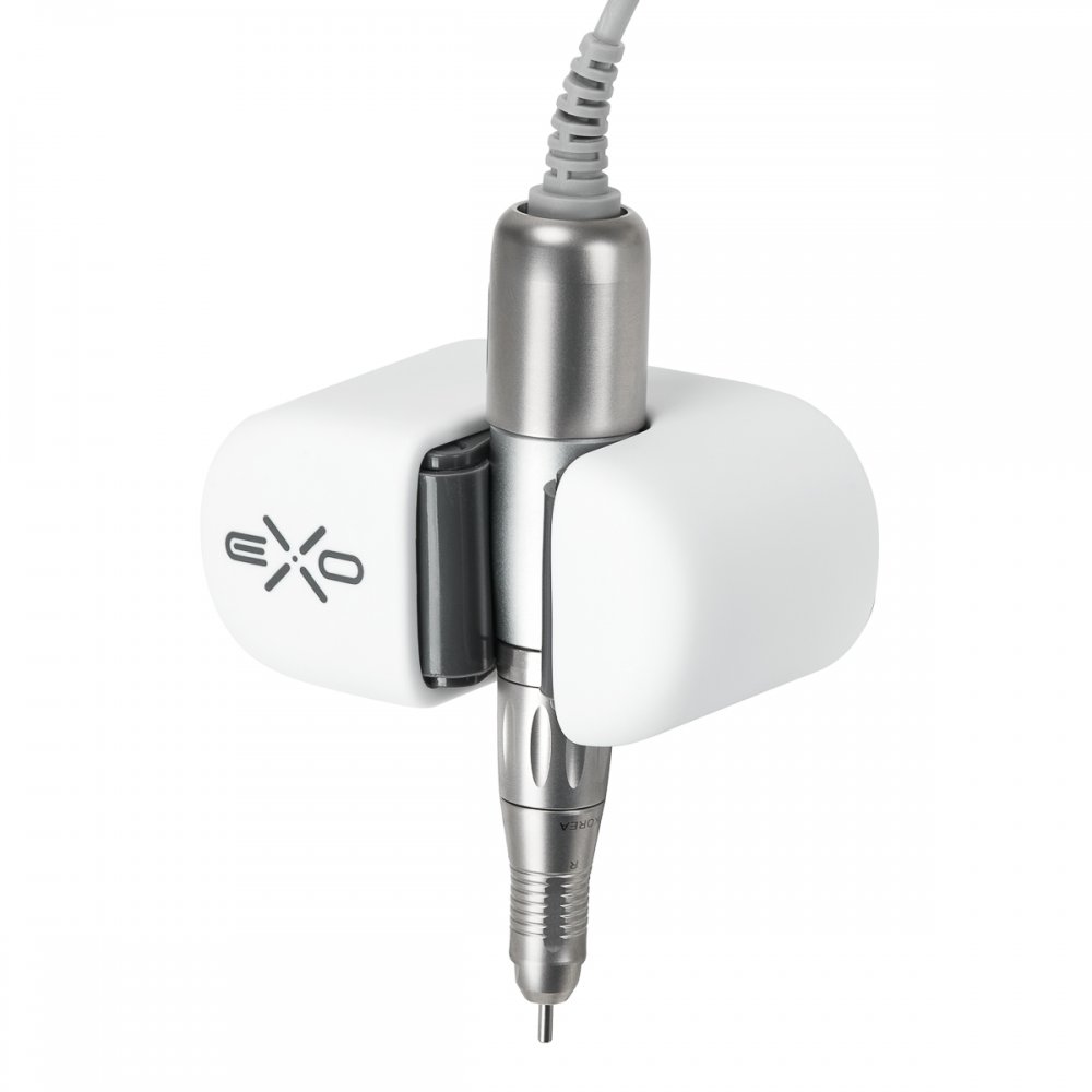 Uniwersalny uchwyt EXO przeznaczony do zawieszenia głowicy frezarki w pobliżu miejsca pracy. Możliwość przyklejenia go do ściany, biurka lub szafki podologicznej w najwygodniejszym miejscu, by jak najbardziej usprawnić korzystanie z urządzenia. Uchwyt chroni rączkę przed przypadkowym upadkiem, zmniejszając prawdopodobieństwo uszkodzeń. Wykonany z wytrzymałego tworzywa, gwarantuje stabilność i trwałość. Szybki montaż zapewnia specjalna naklejka z taśmą montażową, która jest częścią zestawu. Produkt uwzględnia kwestie higieny pracy – jest łatwy do czyszczenia i dezynfekcji. Chwytak pasuje do większości głowic dostępnych na rynku.
