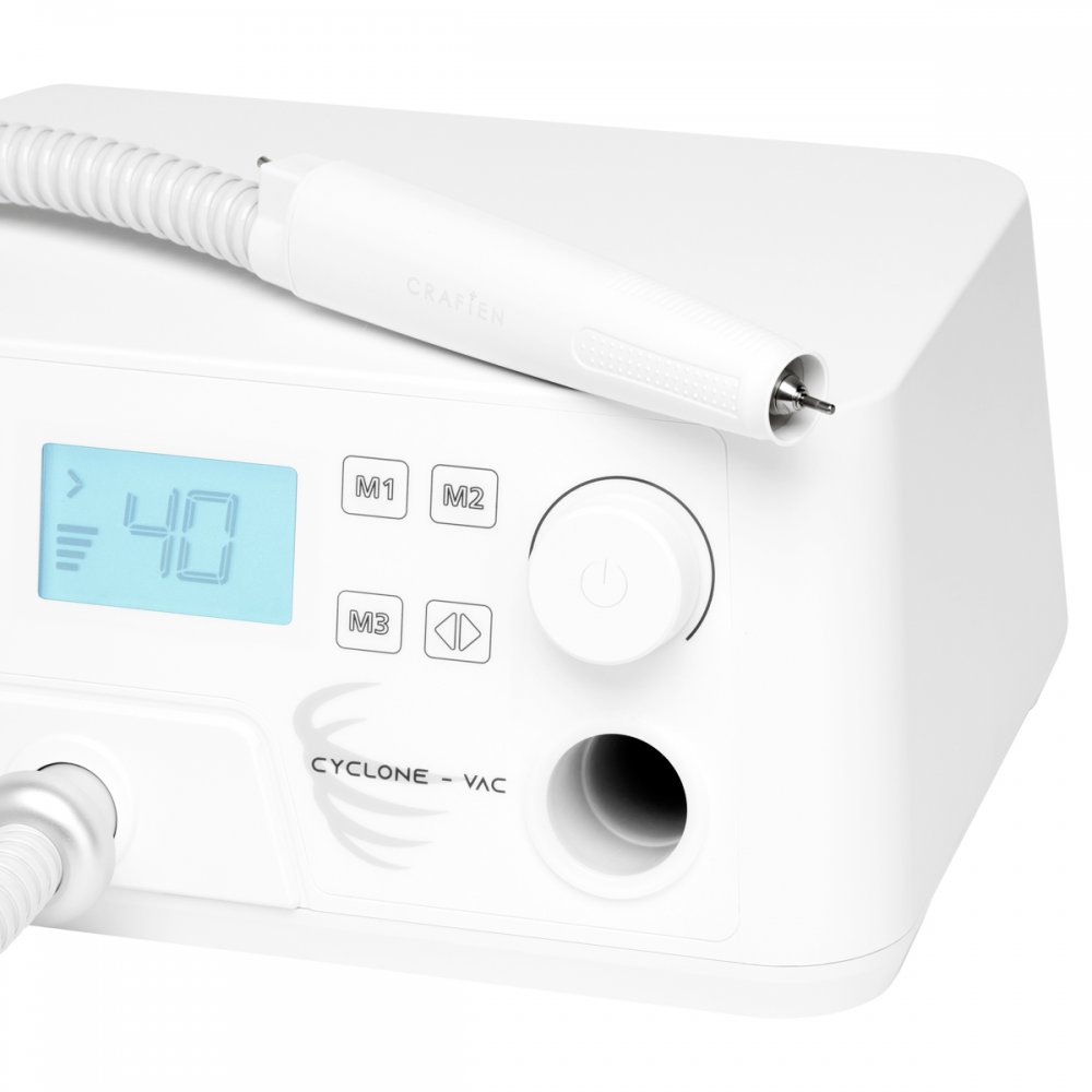Estetyczna, futurystyczna obudowa w odcieniach bieli doskonale wpasuje się w każde wnętrze. Specjalne miejsce na odłożenie głowicy pozwala na znacznie bardziej komfortową pracę, a antypoślizgowe nóżki zapewniają stabilność urządzenia w trakcie użytkowania. Frezarka z pochłaniaczem Saeyang Cyclone-Vac objęta jest 12-miesięczną gwarancją.