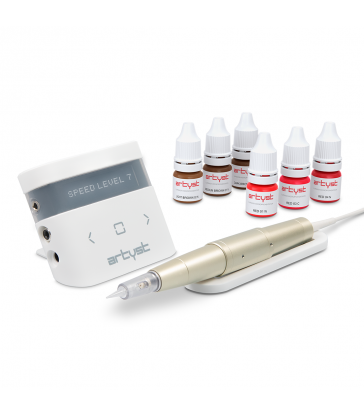 Pakiet startowy Gold Champagne marki Artyst to kompletny zestaw do makijażu permanentnego oczu i ust, zawierający sprzęt i pigmenty najwyższej klasy marki Artyst.