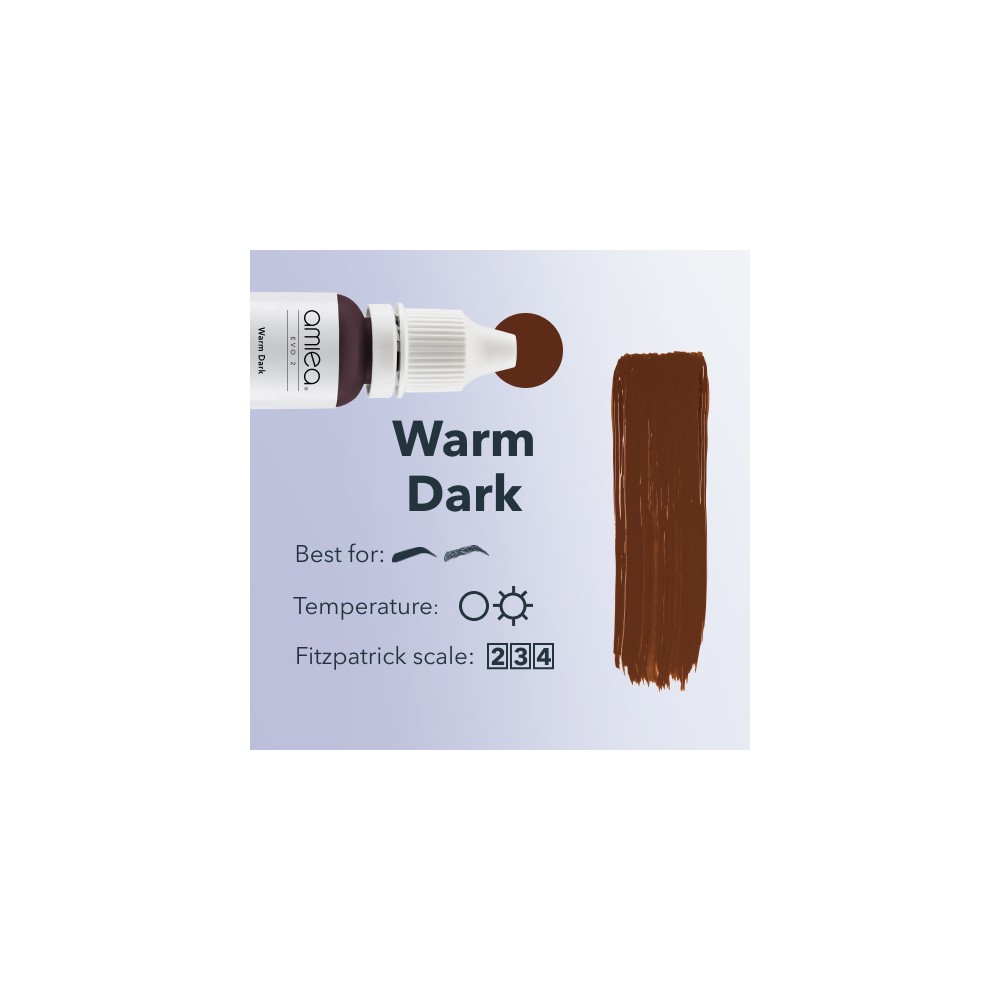 Warm Dark to ciemny odcień ciepłego, czekoladowego brązu. Doskonały dla ciemnych szatynek i brunetek. Sprawdzi się w przypadku tłustej skóry o tonacji chłodniej i ziemistej. Wówczas przybierze odcień bardziej neutralny. Po wygojeniu pozostaje intensywnym głębokim brązem.