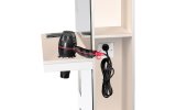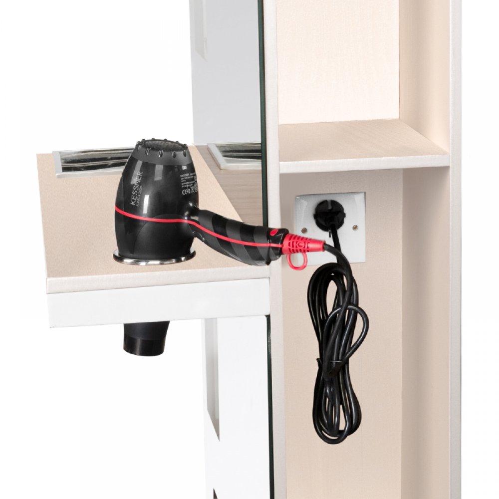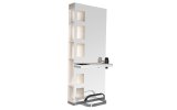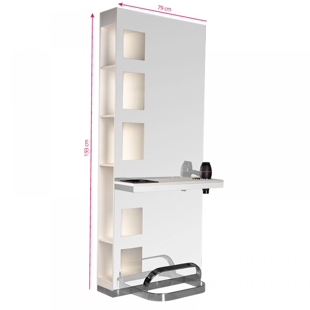 Nowoczesna konsola fryzjerska z dużym lustrem i podręcznymi półeczkami z obu stron. Zawartość półek z jednej strony są widoczne przez "okienka" Wykończenie najwyższej klasy. Elegancki i jednoczesnie uniwersalny element wnetrza, który podkresli charakter każdego salonu.