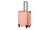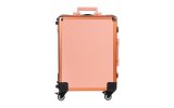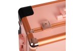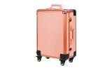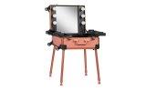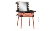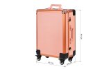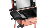 Funkcjonalny kufer kosmetyczny w formie wygodnej, przenośnej walizeczki na kółkach. Idealne rozwiązanie dla mobilnych kosmetyczek czy wizażystek. Bardzo pojemny. Posiada cztery teleskopowe nogi, dzięki którym możemy odpowiednio wyregulowac wysokość stanowiska. Po bokach lustra oświatlenie. Wewnatrz kuferka dodatkowo cztery składane półeczki na drobne akcesoria. Kolor różowego złota.