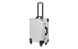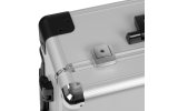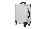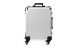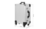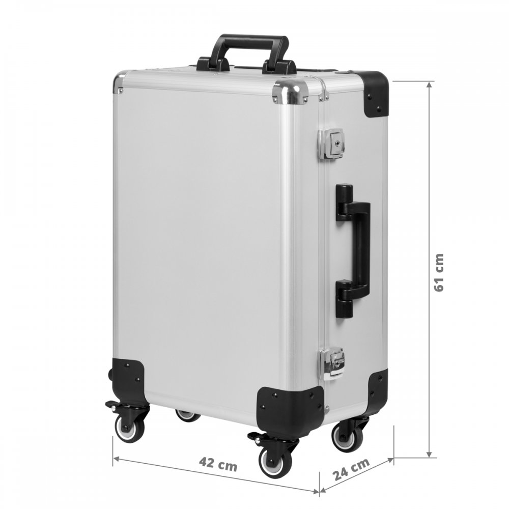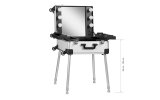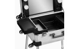 Funkcjonalny kufer kosmetyczny w formie wygodnej, przenośnej walizeczki na kółkach. Idealne rozwiązanie dla mobilnych kosmetyczek czy wizażystek. Bardzo pojemny. Posiada cztery teleskopowe nogi, dzięki którym możemy odpowiednio wyregulowac wysokość stanowiska. Po bokach lustra oświatlenie. Wewnatrz kuferka dodatkowo cztery składane półeczki na drobne akcesoria. Kolor srebrny.