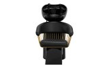 Odpowiednio wyprofilowany fotel wypełniony trwałą pianką zapewnia wysoki komfort użytkowania i relaks klienta na czas usługi. Pokrycie ze skóry syntetycznej w odcieniach czerni zapewnia wieloletnią wytrzymałość oraz łatwość czyszczenia. Oryginalny, elegancki wygląd myjni wraz z polerowanymi elementami w odcieniach złota nadają przestrzeni niepowtarzalnego wyrazu. W zestawie znajduje się kompletna armatura, w tym bateria, słuchawka prysznicowa oraz dedykowane węże, aby zapewnić całkowity zestaw narzędzi do pracy.