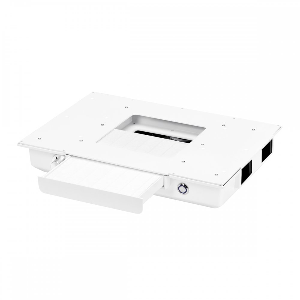 Pochłaniacz montowany jest pod blat stołu kosmetycznego, dzięki temu zyskujemy więcej miejsca na stanowisku pracy.