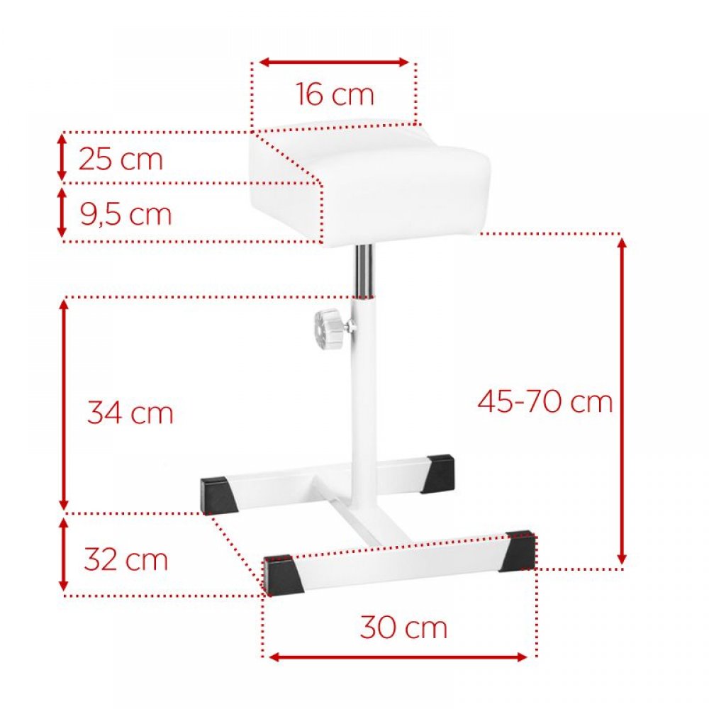 Podnóżek ma regulowaną wysokość, dzięki czemu może być pomocny podczas wykonywania wszelakich zabiegów, a w szczególności podczas przeprowadzania zabiegu pedicure.