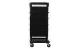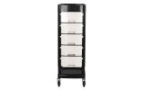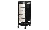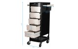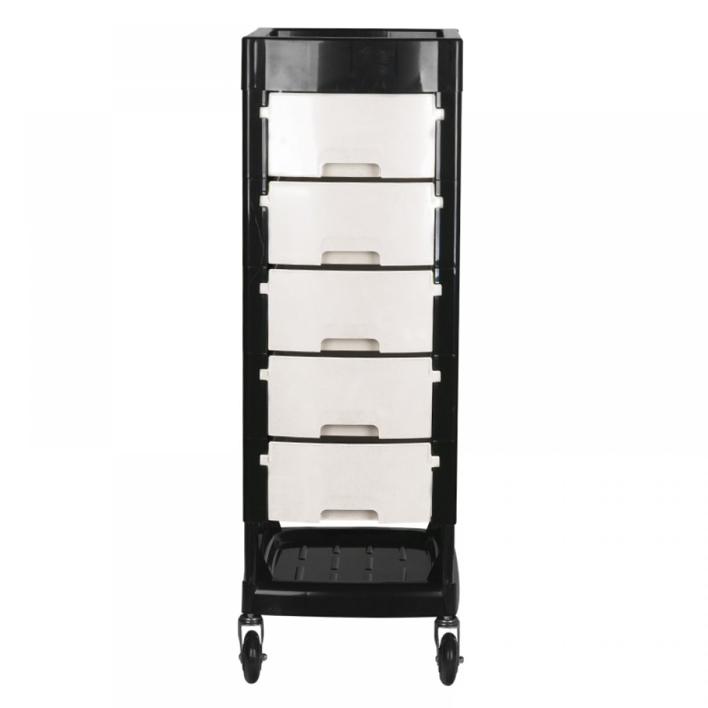 Pomocnik fryzjerski Gabbiano to wysokiej jakości mebel. Wykonany został w wytrzymałego tworzywa ABS ze stalową konstrukcją ramy, zapewniającą wysoką stabilność i wytrzymałość. Całość jest osadzona na bardzo wytrzymałych łożyskowanych, gumowych kółkach. Dominujący kolor czerni przełamany kolorem szuflad idealnie dopasuje się do wystroju Twojego salonu!