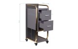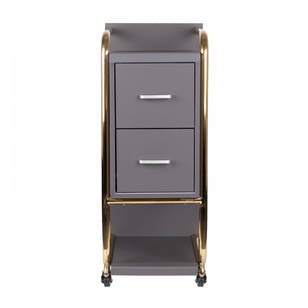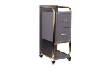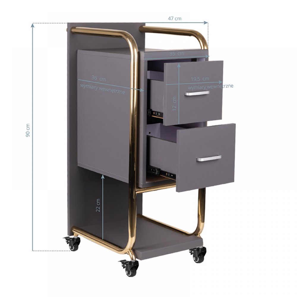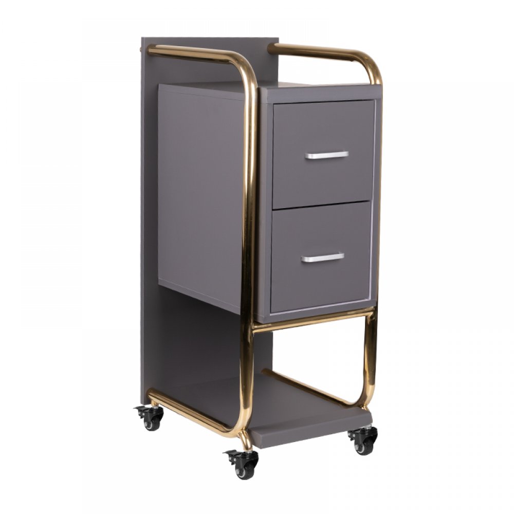 Wysokiej jakości pomocnik fryzjerski Gabbiano Solo, konstrukcja stalowa z korpusem wykonanym z płyt drewnianych. Posiada dwie szuflady i solidne metalowo-gumowe kółka z hamulcami.