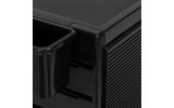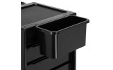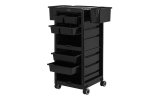 Pojemny organizer wyposażony jest w zestaw kuwet, które pomogą zadbać o porządek w miejscu pracy, posegregować odpowiednio niezbędne w pracy fryzjera przybory. W zestawie znajduje się sześć pojemników: dwa bez przegródek, dwa z przegródkami oraz dwa wąskie i głębsze. Ich układ w organizerze można dowolnie zmieniać, dopasowując go do własnych potrzeb, a znaczny wybór różnych typów szuflad pozwala na posegregowanie przyborów według uznania. Dodatkowo dwie najgłębsze kuwety można umieszczać na różnych wysokościach po bokach pomocnika, dzięki czemu ułożone w nich przybory zawsze znajdą się na odpowiednim poziomie. Zabudowany tył zabezpiecza szuflady przed przypadkowym ich wysunięciem w drugą stronę, co mogłoby skutkować uszkodzeniem znajdujących się w nich przyborów.
