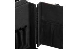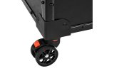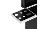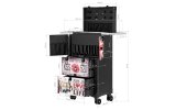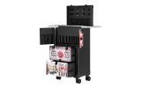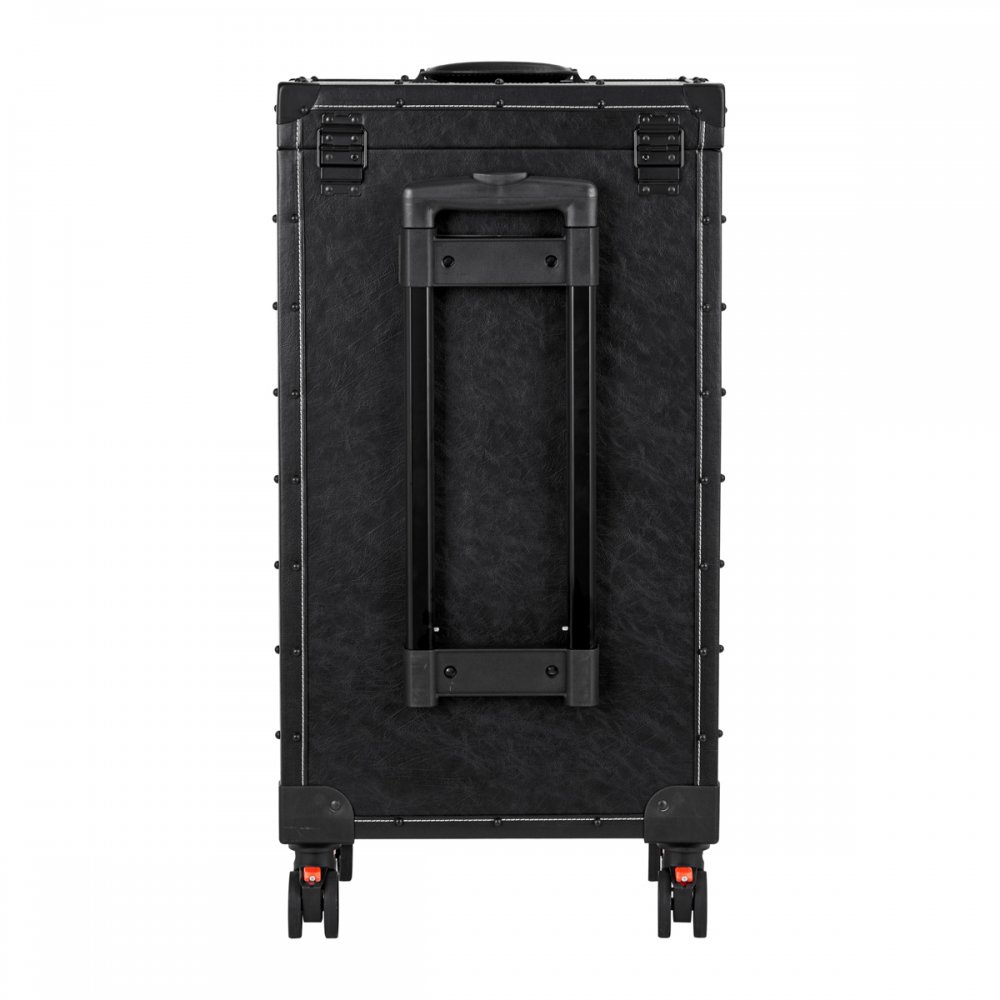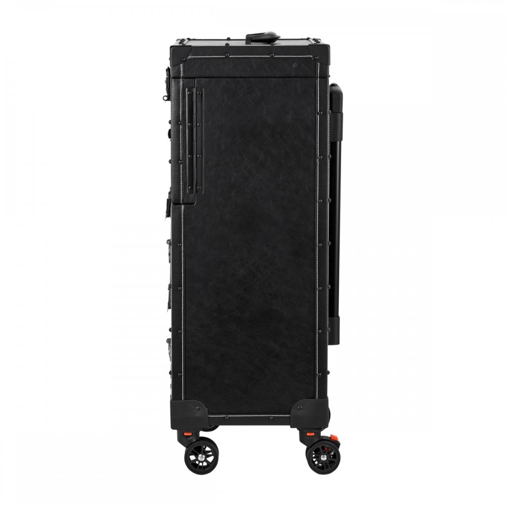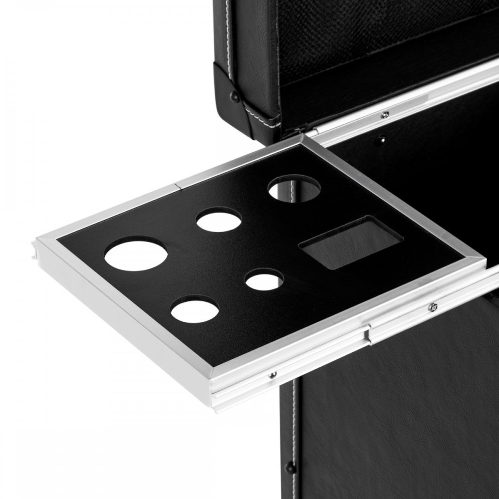 Pojemny organizer wyposażony jest w znaczną ilość schowków. Wysuwane półeczki z uchwytami i miejscami na akcesoria, szuflady, schowki oraz specjalne kieszonki do przechowywania produktów i narzędzi barberskich ułatwiają zachowanie porządku na stanowisku pracy oraz znacząco wpływa na organizację przestrzeni. Łatwy montaż i demontaż kółek poprawiają mobilność mebla, dzięki czemu pomocnik można swobodnie przemieszczać. Wysuwana rączka, znajdująca się z tyłu pomocnika, pozwala na łatwe transportowanie mebla.