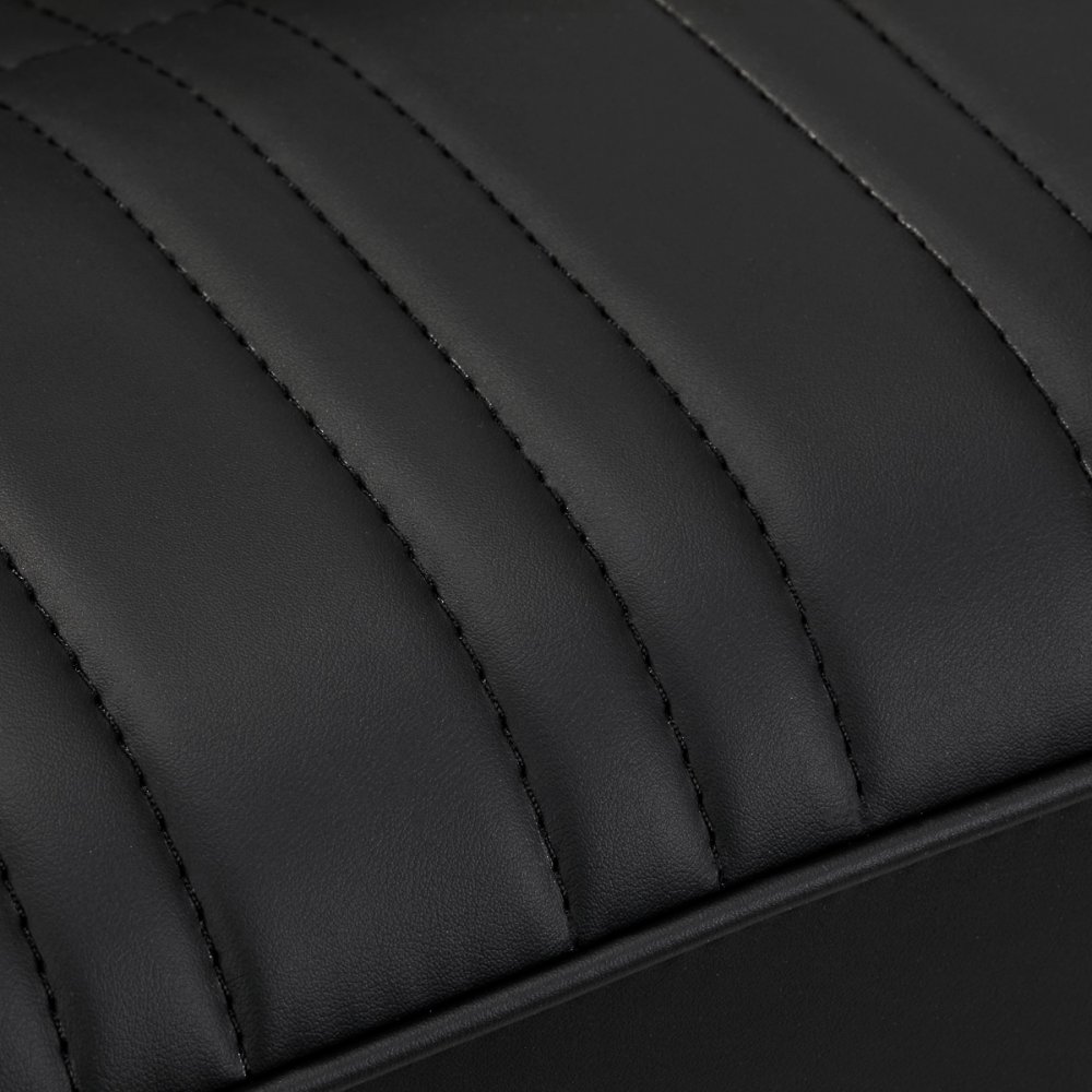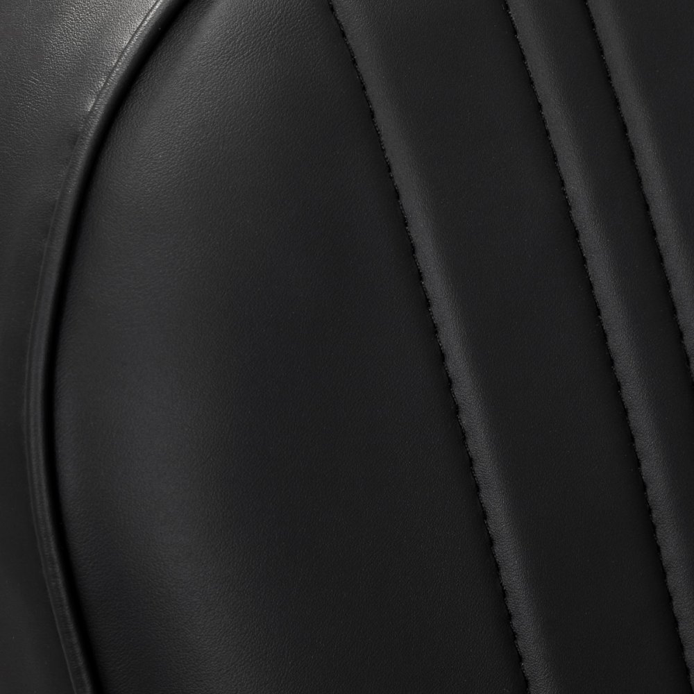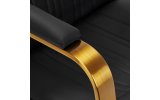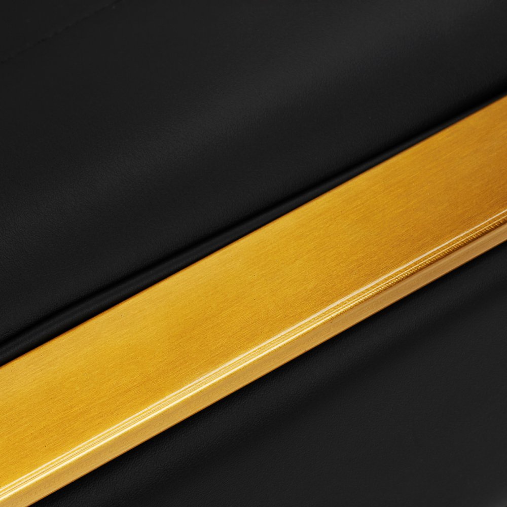 Wypełnienie z trwałej, odpornej na odkształcenia pianki oraz obicie wykonane z przyjemnej w dotyku skóry syntetycznej zapewniają trwałość mebla i jego komfortowe użytkowanie na przestrzeni lat. Zastosowane materiały sprawiają również, że sprzęt jest odporny na wilgoć, wytrzymały oraz łatwy do czyszczenia. Pokrycie w odcieniach czerni, estetyczne przeszycia oraz elementy w odcieniach złota nadają mu niepowtarzalnego charakteru. Nowoczesny design tego sprzętu sprawia, że idealnie wpisuje się w atmosferę wielu profesjonalnych salonów, nadając im wyjątkowego stylu.