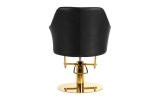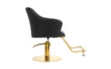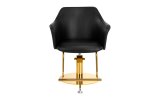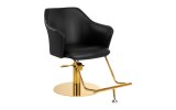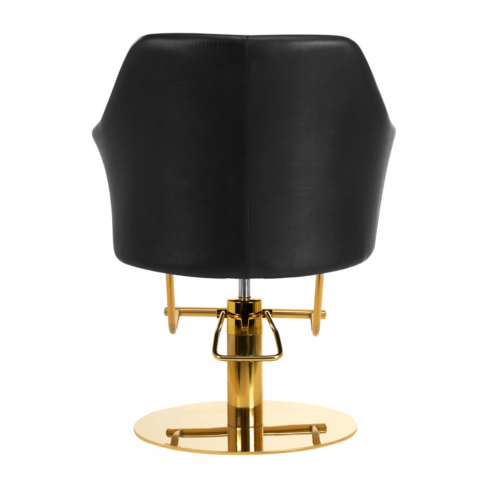 Okrągła, solidna podstawa gwarantuje stabilność w trakcie użytkowania. Gładka powierzchnia o lustrzanym wykończeniu nadaje elementowi elegancki wygląd oraz sprawia, że ten jest łatwy do utrzymania w czystości. Wygodne siedzisko z wypełnieniem z pianki zapewnia wysoki komfort użytkowania, nawet podczas wielogodzinnych zabiegów. Znacznym plusem jest dedykowany do tego modelu podnóżek w odcieniach złota, który zapewnia stabilne oparcie dla stóp użytkownika oraz nadaje meblowi stylowego wyglądu. Podłokietniki pozwalają na prawidłowe ułożenie barków klienta – sprawia to, że nie chowa głowy w ramionach ani się nie garbi – wyraźnie ułatwiając wykonywanie precyzyjnych zabiegów, takich jak strzyżenie.