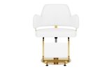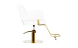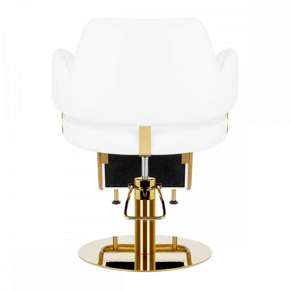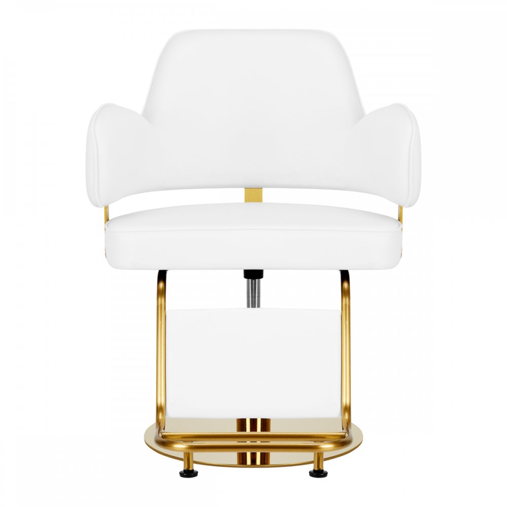 Wygodny mebel wypełniony jest trwałą, odporną na odkształcenia pianką, z kolei obicie wykonane jest z przyjemnej w dotyku skóry syntetycznej. Zastosowane materiały zapewniają komfortowe użytkowanie mebla przez długi czas i sprawiają, że sprzęt jest odporny na wilgoć, wytrzymały oraz łatwy do czyszczenia. Pokrycie w odcieniach bieli oraz ozdobne elementy w barwach złota nadają mu wyraz ponadczasowej elegancji. Fotel fryzjerski Gabbiano Linz NQ wyróżnia minimalistyczny design, który nadaje mu wyjątkowy charakter i sprawia, że fotel będzie doskonale prezentować się w wielu eleganckich salonach.