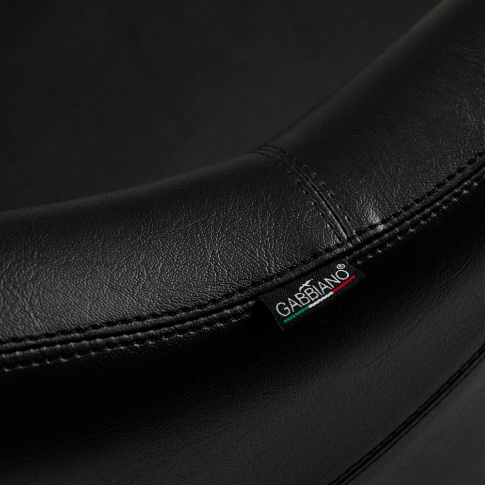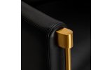 Fotel wypełniony jest pianką, która jest trwała i nie odkształca się, zapewniając komfortowe użytkowanie przez długi czas. Obicie wykonane jest z przyjemnej w dotyku imitacji skóry o specyficznej strukturze. Dzięki użyciu takiego materiału, sprzęt jest odporny na wilgoć, wytrzymały i łatwy w czyszczeniu. Pokrycie w odcieniach czerni oraz ozdobne powierzchnie metalowe lakierowane w barwach złota nadają mu wyraz ponadczasowej elegancji. Wyróżniające go klasyczne wykończenie sprawia, że będzie doskonale prezentować się w niemal każdej przestrzeni.
