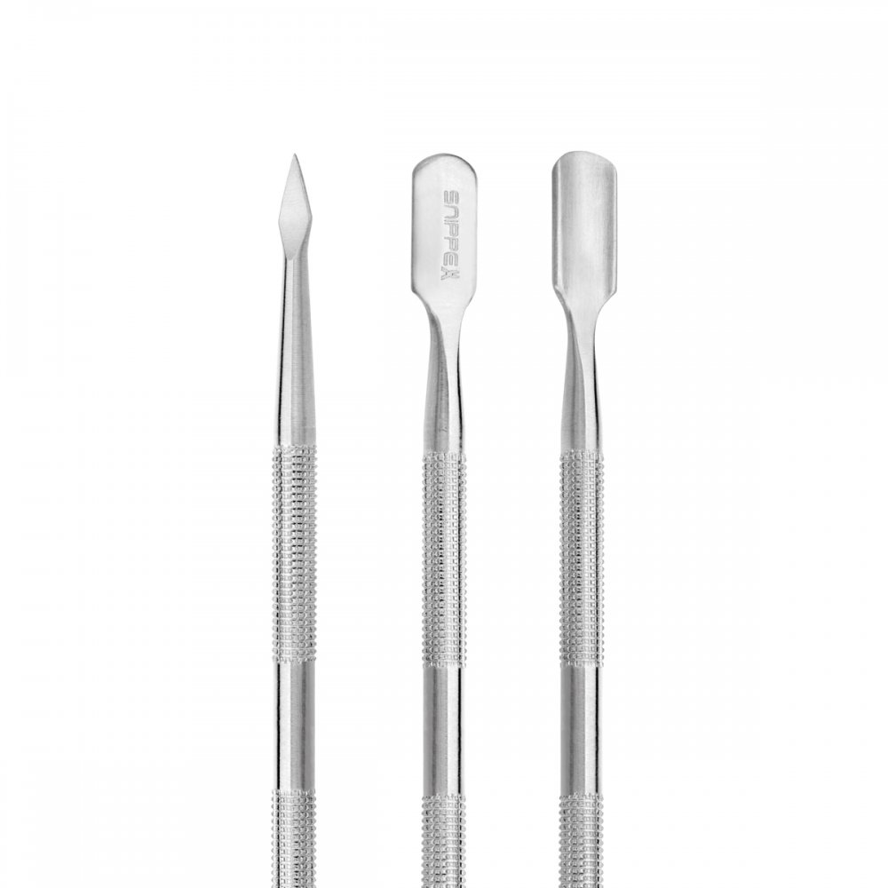 • Zaokrąglona łopatka przeznaczona jest do odsuwania skórek z płytki paznokcia, a także usuwania pozostałości poprzednich stylizacji. Specjalnie wyprofilowana końcówka jest oszlifowana w taki sposób, by nie uszkadzać płytki.