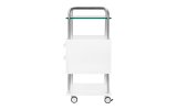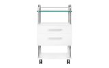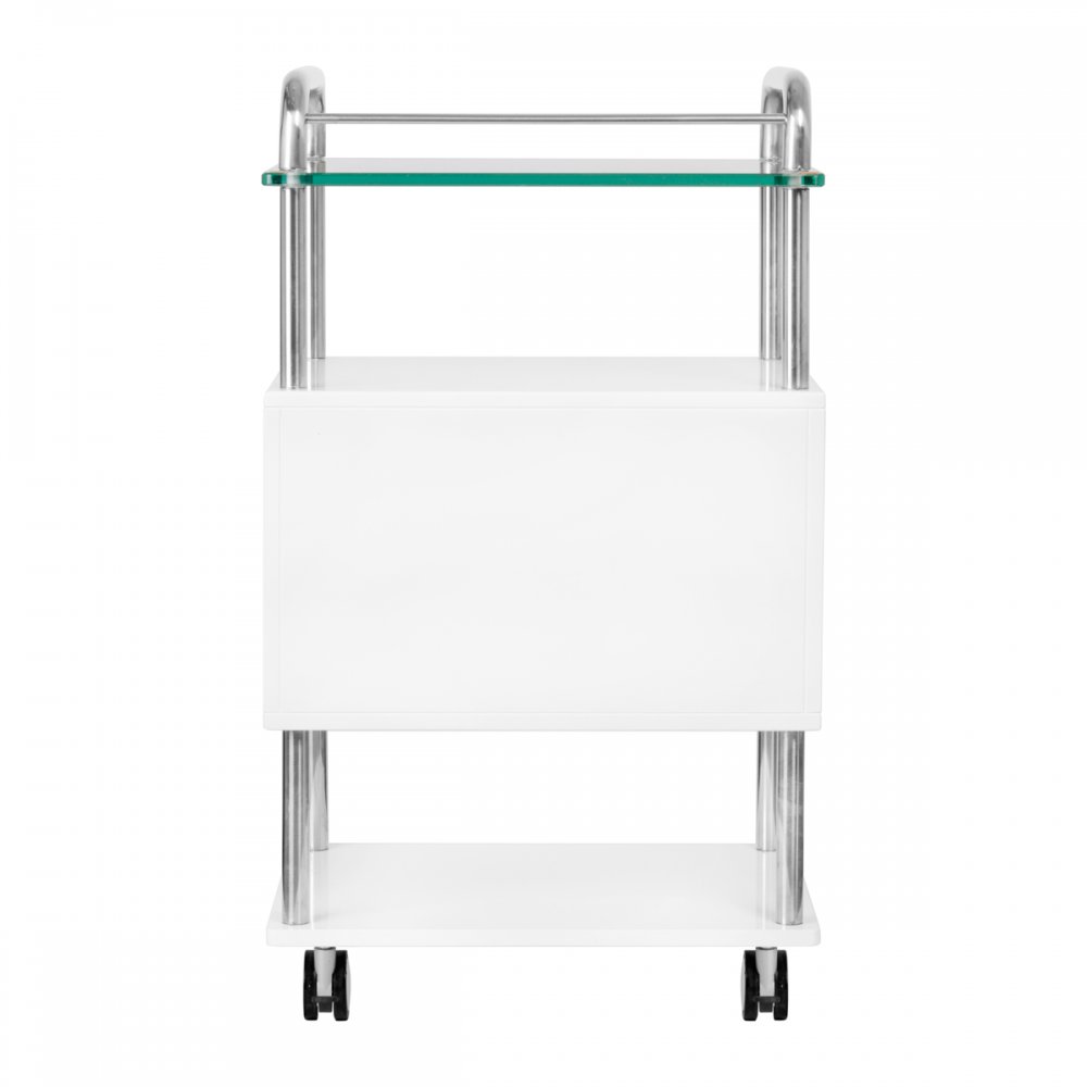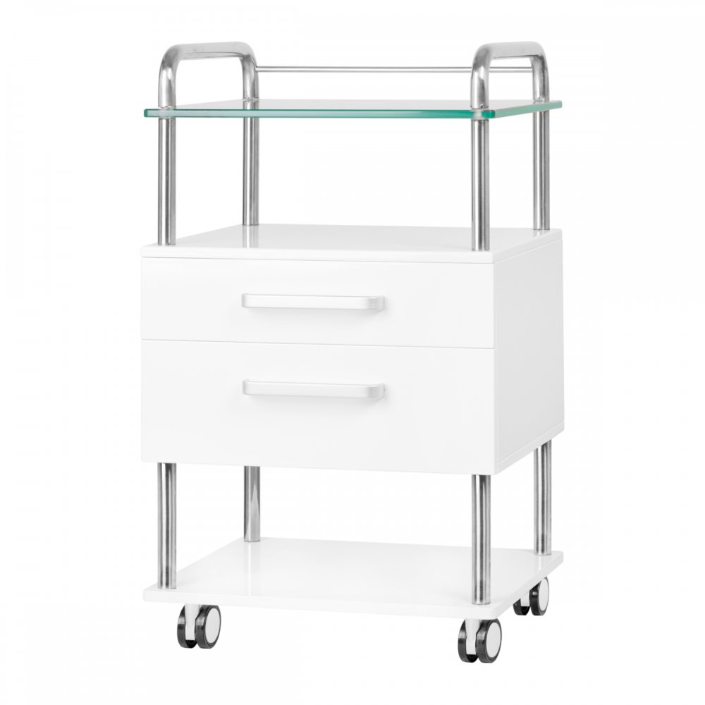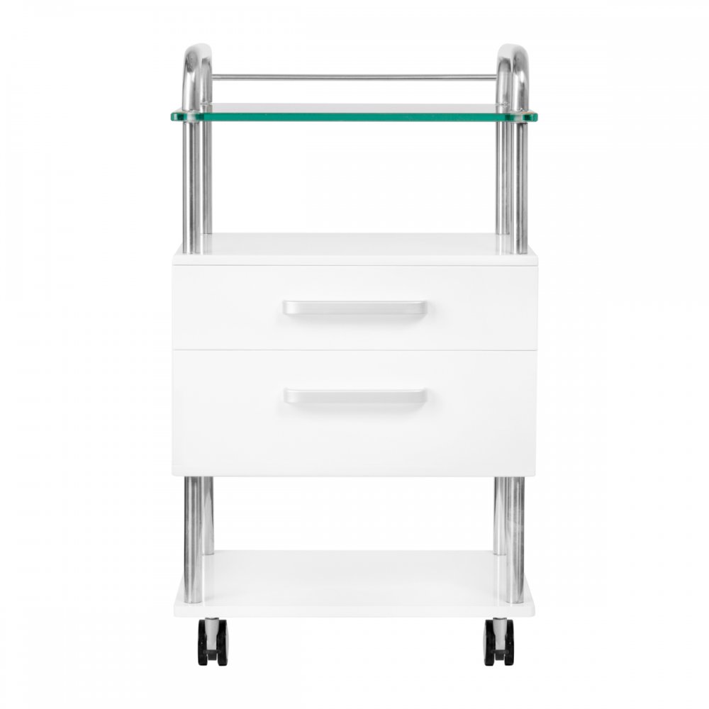 Wysokiej jakości pomocnik podologiczny to funkcjonalny mebel kosmetyczny na kółkach. Dzięki swojej mobilności możesz transportować go do innych pomieszczeń zabiegowych. Pomocnik posiada szklany blat roboczy, dwie szuflady na narzędzia, akcesoria oraz półkę na frezarkę podologiczną lub inne urządzenie.
