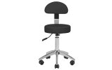 Wygodny taboret kosmetyczny, stabilny na pięcioramiennej podstawie, z gumowanymi kółkami, z możliwością demontażu oparcia, w kolorze czarnym, niezbędny mebel w gabinecie kosmetycznym.