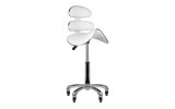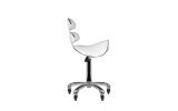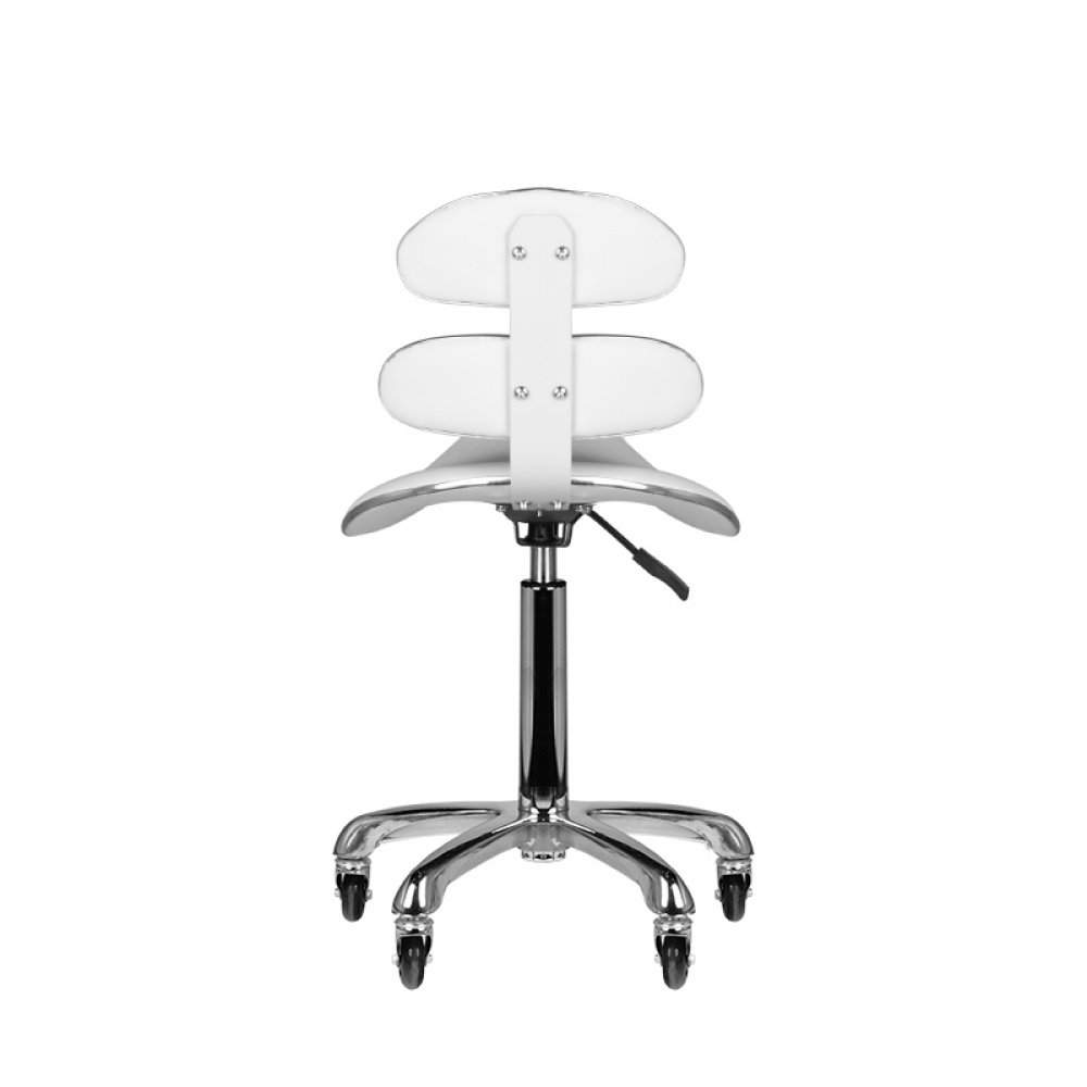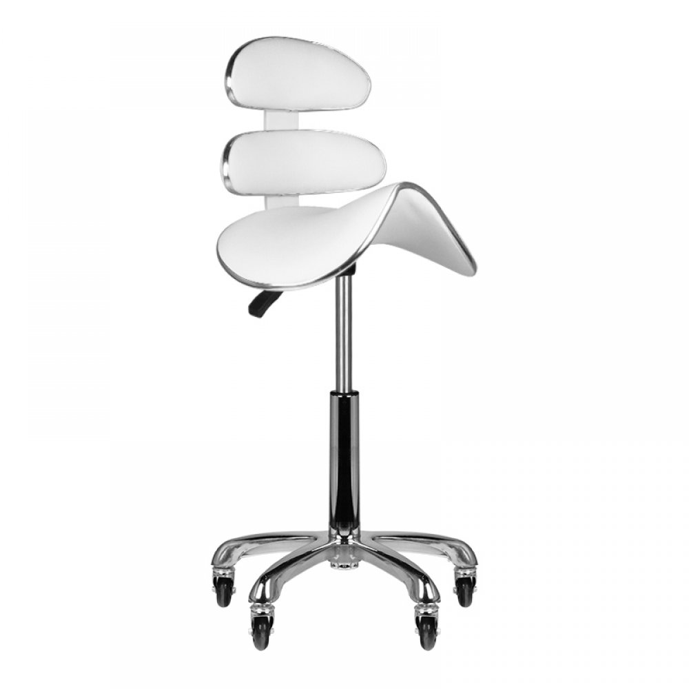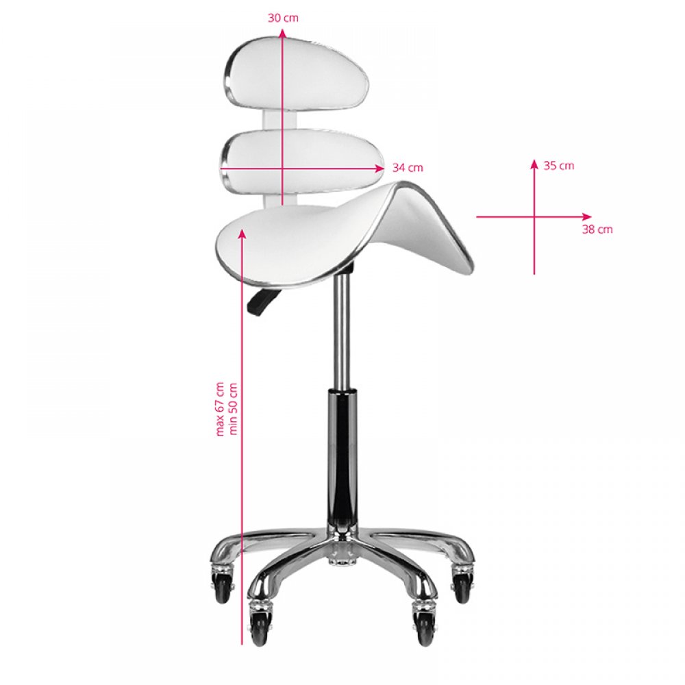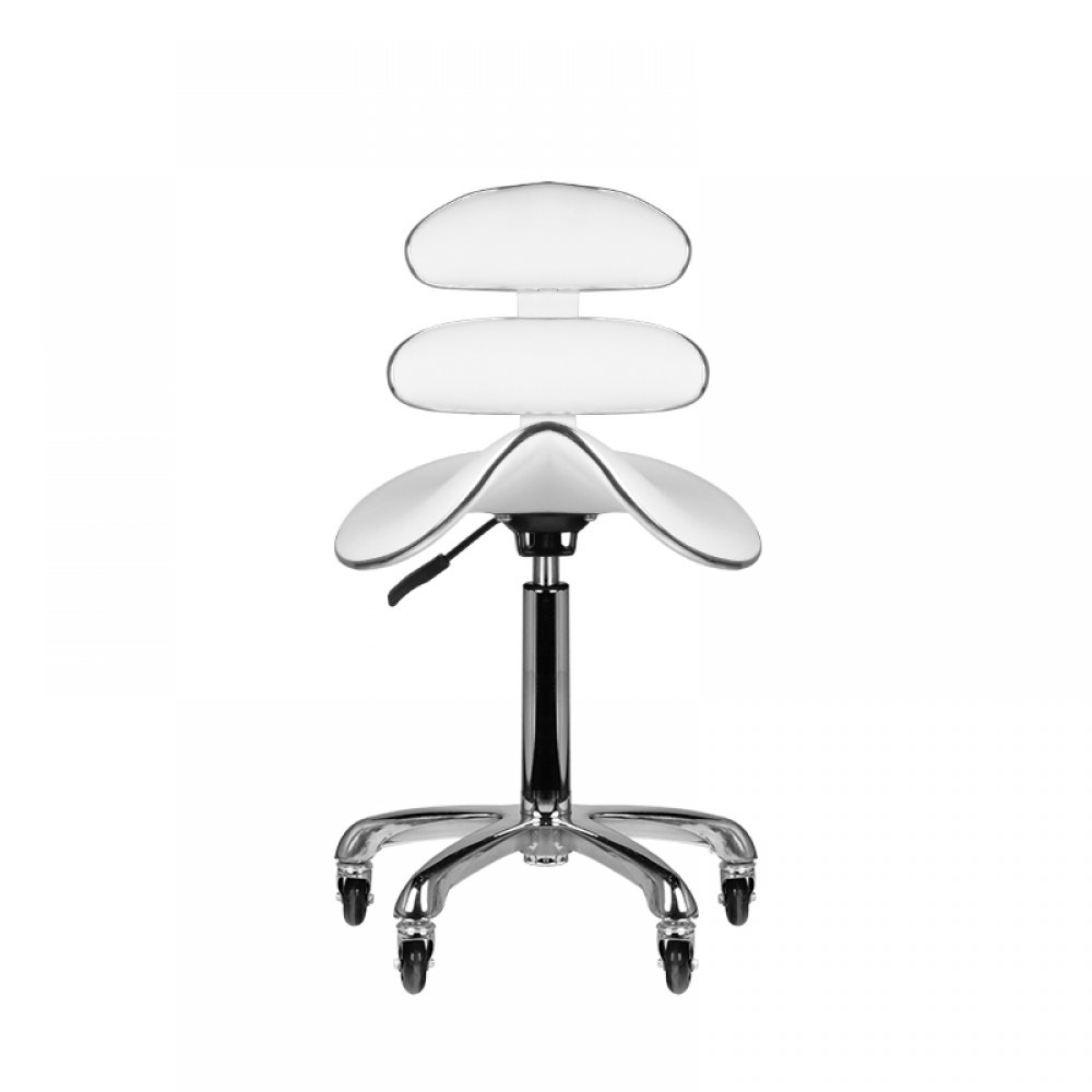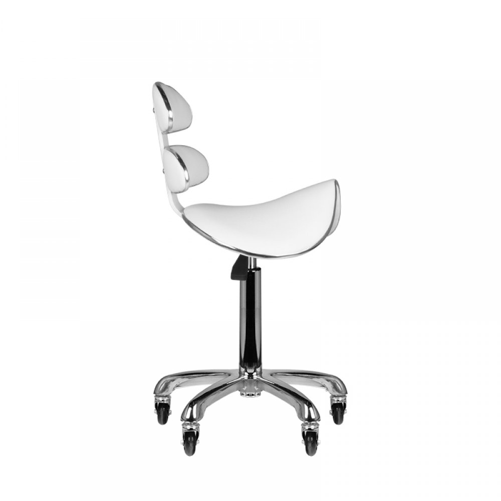 Wygodny, stabilny taboret kosmetyczny z profilowanym siedziskiem i ergonomicznym oparciem. Osadzony na pięcioramiennej podstawie z rewelacyjnymi kauczukowymi i łożyskowanymi kółkami Roll Speed, które gwarantują lekkośc w przemieszczaniu się. Wykonany z eko-skóry w kolorze białym.