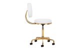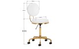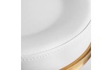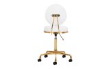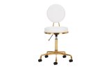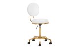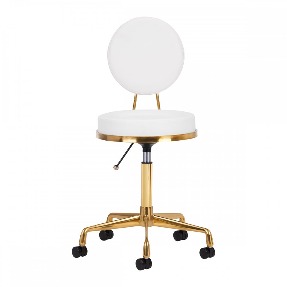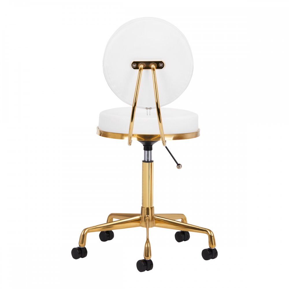 Ten złoto-biały taboret posiada wygodne siedzisko oraz oparcie pokryte skórą ekologiczną. Znajduje się na stabilnej pięcioramiennej podstawie. Skonstruowany z metalowych części jest trwały i odporny na zniszczenia. Wysokość siedziska jest sprawnie regulowana. Plastikowe kółka pozwalają na łatwą zmianę położenia. Siedzisko jest w pełni obrotowe.