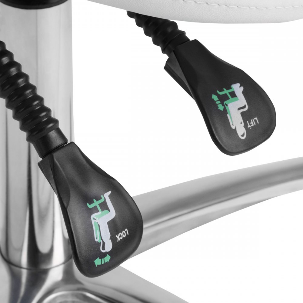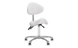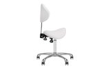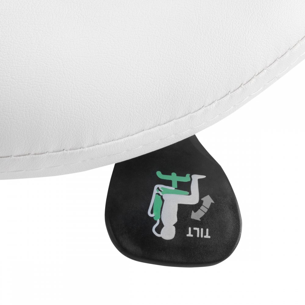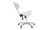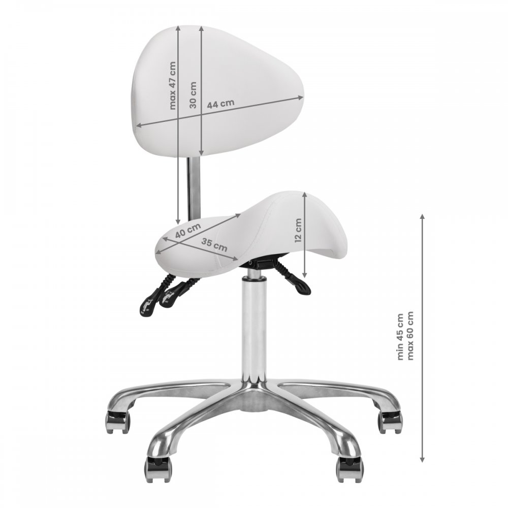 Wygodny, ekskluzywny , stabilny taboret kosmetyczny z oparciem oraz profilowanym siedziskiem, na pięcioramiennej bardzo stabilnej podstawie podstawie. Regulowany w trzech płaszcztznach: