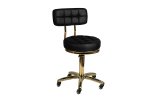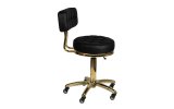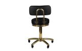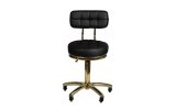 Wyjątkowy taboret kosmetyczny w kolorze czarnym z pikowanym siedziskiem i wygodnym oparciem. Elementy metalowe pięnie błyszczą złotym kolorem. Posiada regulację wysokości i pęcioramienną podstawę wyposażoną jest w solidne metalowo-gumowe kółka.