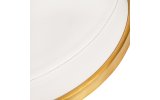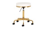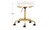 Ten złoty taboret ma wygodne białe siedzisko pokryte skórą ekologiczną. Znajduje się na stabilnej pięcioramiennej podstawie. Stworzony ze stopów metali, jest trwały i odporny na zniszczenia. Wysokość siedziska jest sprawnie regulowana. Plastikowe kółka pozwalają na łatwą zmianę położenia. Siedzisko jest w pełni obrotowe.