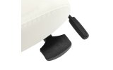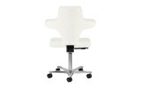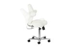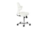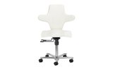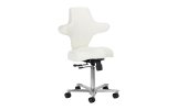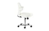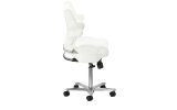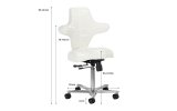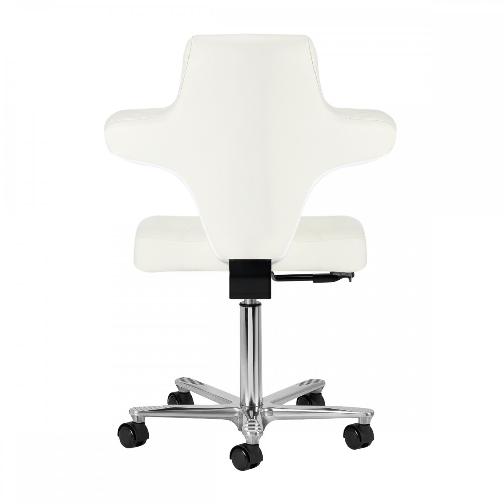 Pięcioramienna, odpowiednio zaprojektowana podstawa sprawia, że taboret jest stabilny, nawet podczas intensywnej pracy. Dodatkowo wyposażony jest w kółka, co ułatwia jego przemieszczanie. Krzesło jest stabilne i wytrzymałe. Obicie wykonano z imitacji skóry w odcieniach bieli, dzięki użyciu takiego materiału jest ono odporne na wilgoć i łatwe w czyszczeniu.