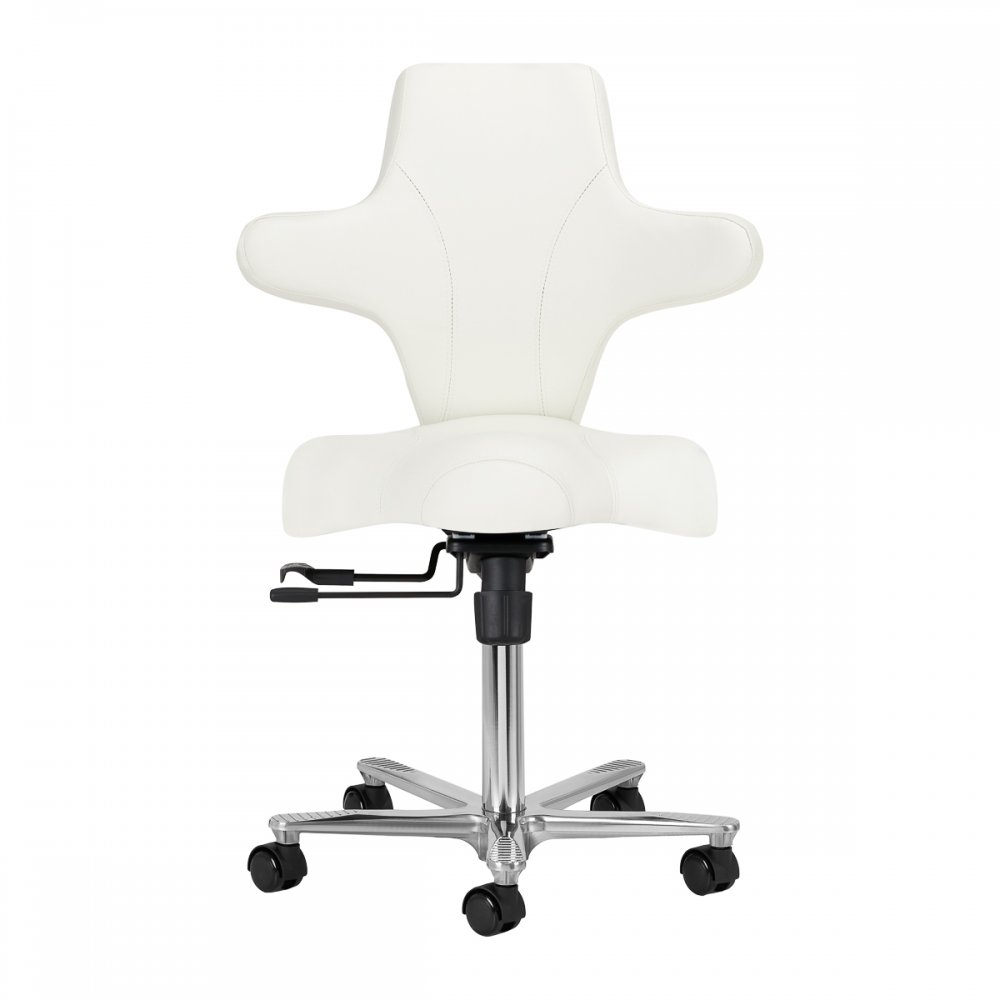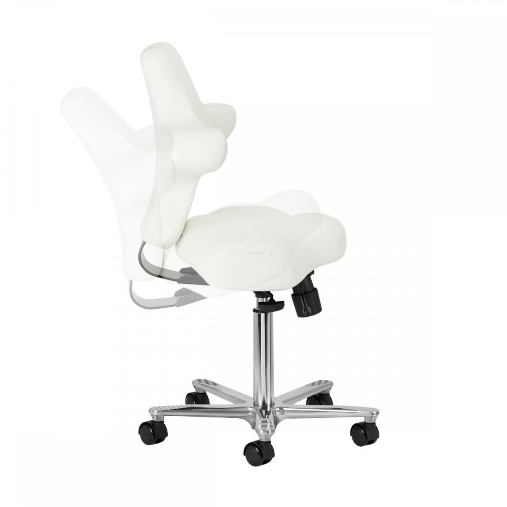 Możliwość regulacji wysokości w zakresie 55-57 cm pozwala przybrać odpowiednią pozycję w trakcie wykonywania usług. Boczne wypustki umożliwiają podparcie rąk podczas siadania na krześle tyłem, zwłaszcza w trakcie usług takich jak wykonywanie masażu czy makijażu. Mechanizm pełnego obrotu, że praca staje się bardziej efektywna i wygodna. Krzesło posiada również funkcję kołyski z możliwością blokady, co pozwala na ergonomiczne ułożenie ciała podczas pracy. Wysunięcie siedziska również można manualnie dostosowywać.