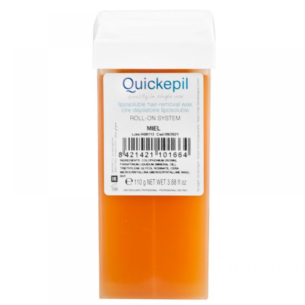 Wosk QUICKEPIL roll-on jest specjalnie stworzony dla kosmetyczek, które szukają znakomitych rezultatów. Dzięki specjalnej recepturze rolka rozciąga wosk na znacznie cieńsze paski co powoduje, że stygnie niemal natychmiast minimalizując pieczenie. Produkt jest następnie łatwo usunąć za pomocą pasków. Uniwersalny wosk do każdego rodzaju skóry na bazie wosków pszczelich.