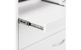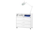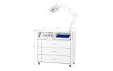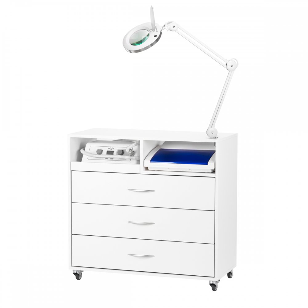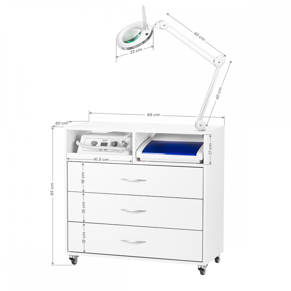 Solidny unit podologiczny został stworzony, aby ułatwiać pracę osobie wykonującej zabiegi. Trzy pojemne szuflady pomieszczą wszelkie potrzebne akcesoria, narzędzia i produkty. Znaczącym atutem jest wysuwana półeczka, na której można umieścić niezbędne w pracy podologa urządzenia, takie jak sterylizator czy frezarka. Będzie również doskonałym miejscem na przybory czy preparaty, które warto mieć stale pod ręką. Mebel wyposażony jest w kółka, co usprawnia pracę i jego przestawianie. Pozwalają one łatwo transportować go między pomieszczeniami. Uchwyt TUBE pozwala na mocowanie lampy bezpośrednio do blatu w dowolnym jego miejscu. Pomocnik wykonany jest z trwałych materiałów, łatwy w czyszczeniu i będzie znacząco usprawniał przeprowadzanie specjalistycznych usług.